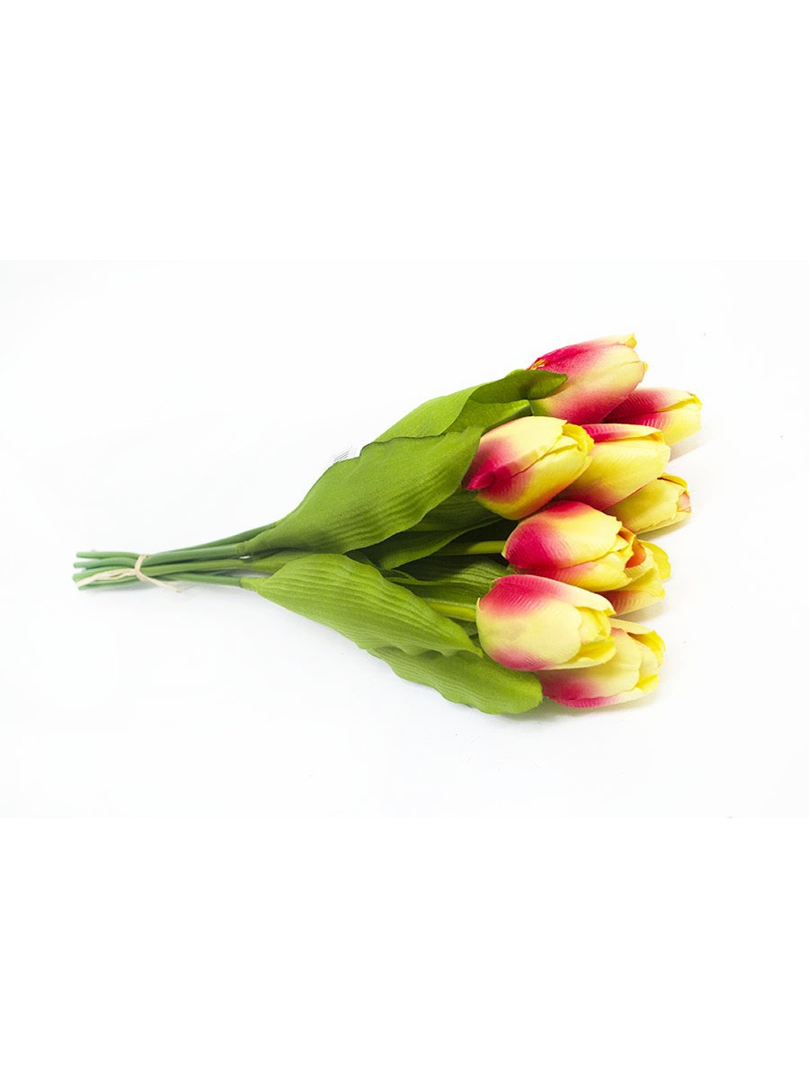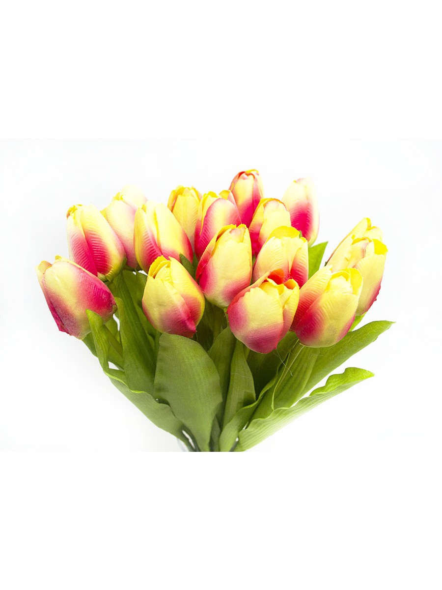 Цветок искусственный Тюльпан букет № 499 - этот прекрасный букет состоит из девяти отдельных тюльпанов, которые вместе образуют нежную и пышную композицию. Прекрасно подойдет для оформления и украшения интерьера вашей комнаты и создаст весеннее настроение. Бутон тюльпанов выполнен в желтом цвете с ярко-красным затемнением отдельных лепестков.