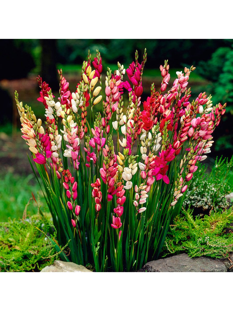 Относится к ирисовым, при посадке в грунт в конце весны цветет в середине лета. Место посадки - только солнечное, грунт - легкий, питательный, нейтральный по кислотности. Глубина посадки - около пяти сантиметров. Высота растения - от тридцати сантиметров, листья - ремневидные, не выразительные, но зато колосья разноцветных ароматных соцветий приятно удивляют цветением в течение почти трех недель. Куртины иксии просто превосходно украшают передние планы клумб, рабаток и вносят тропический колорит в садовые композиции. Можно выращивать в вазонах. Полив начинают после появления ростков, и он должен быть регулярным. На зиму луковицы выкапывают и хранят в прохладном сухом месте.