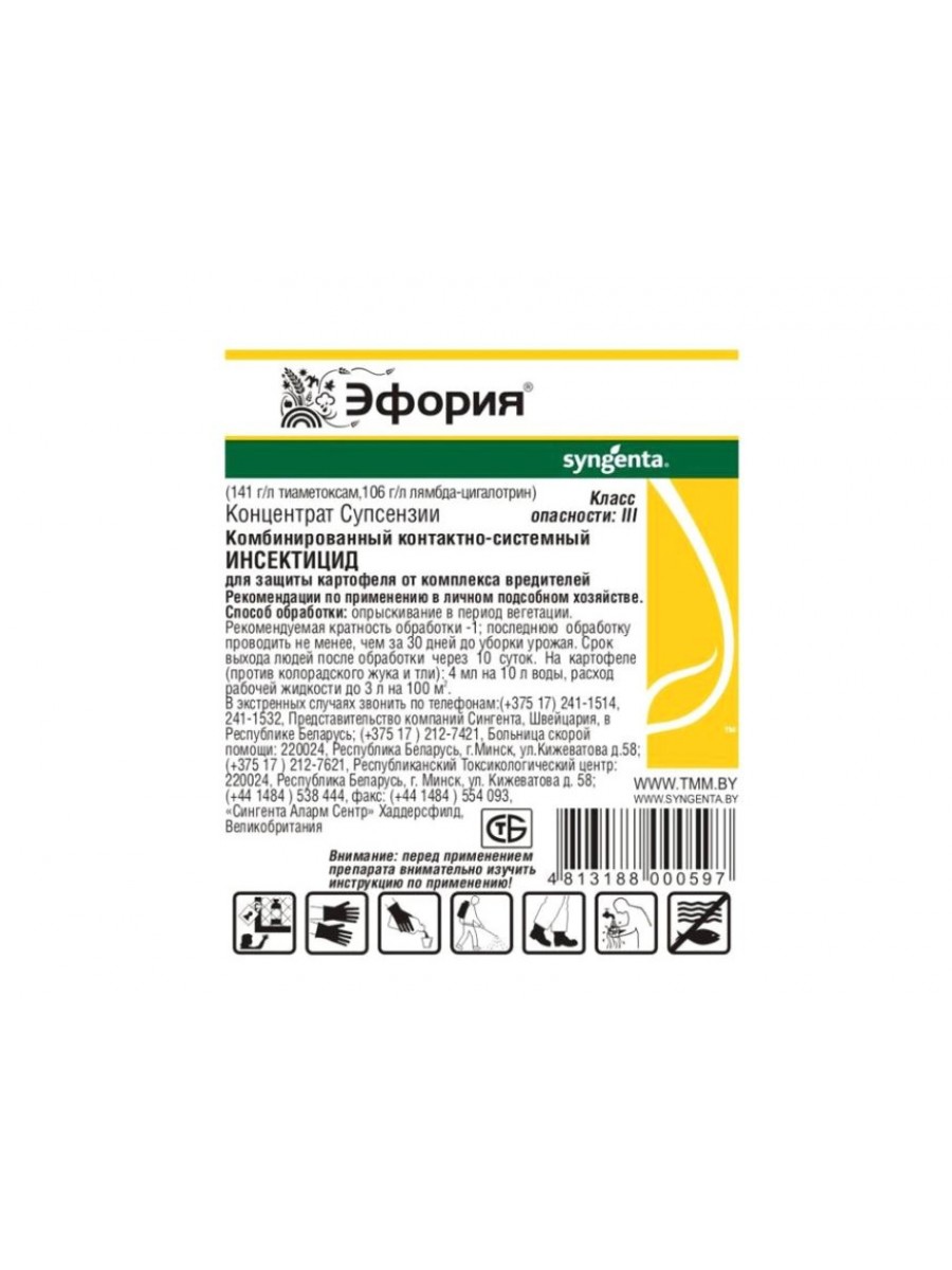 ЭФОРИЯ, КС обеспечивает превосходную защита растений как при проведении плановых обработок, так и при обработках в критических ситуациях. Быстро уничтожает вредителей благодаря лямбда-цигалотрину и действует длительно за счет системного действия тиаметоксама.