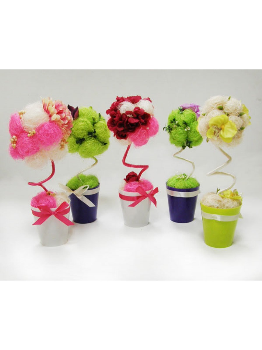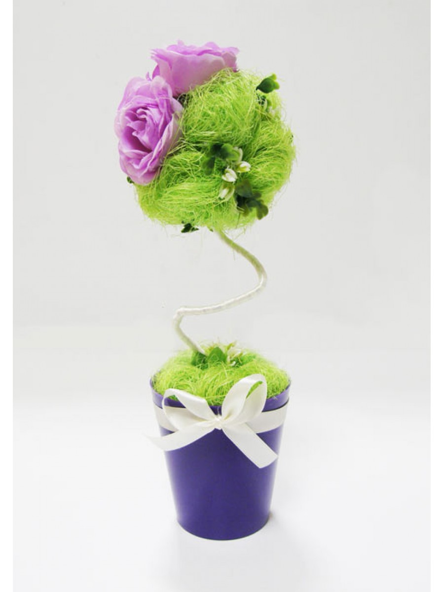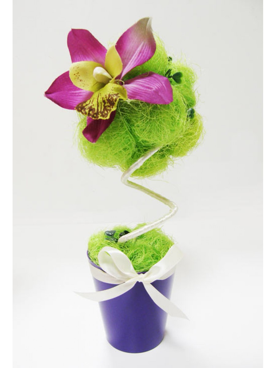 Наши "Деревья счастья" изготавливаются флористами вручную, каждое из них - уникально и неповторимо. Основу композиции составляет натуральное волокно сизаль различных расцветок и качественные искусственные цветы. "Посажен" топиарий в цветной пластиковый горшочек от польского производителя, декорированный ленточкой.