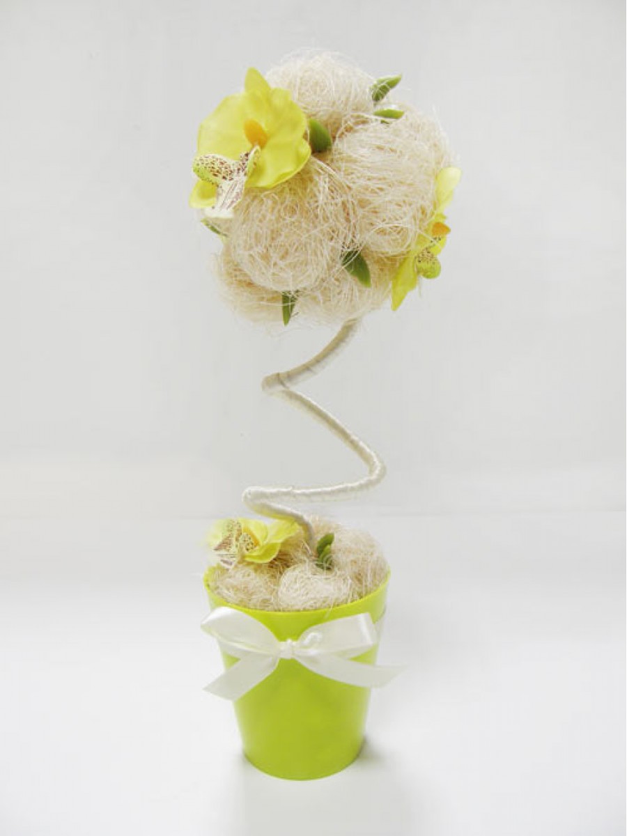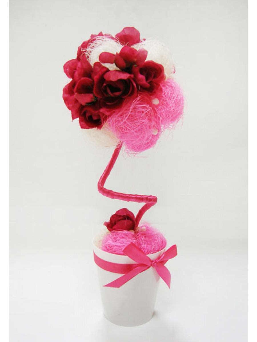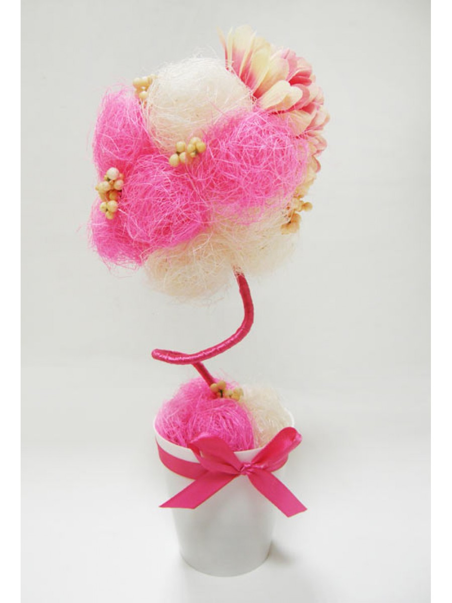 Наши "Деревья счастья" изготавливаются флористами вручную, каждое из них - уникально и неповторимо. Основу композиции составляет натуральное волокно сизаль различных расцветок и качественные искусственные цветы. "Посажен" топиарий в цветной пластиковый горшочек от польского производителя, декорированный ленточкой.