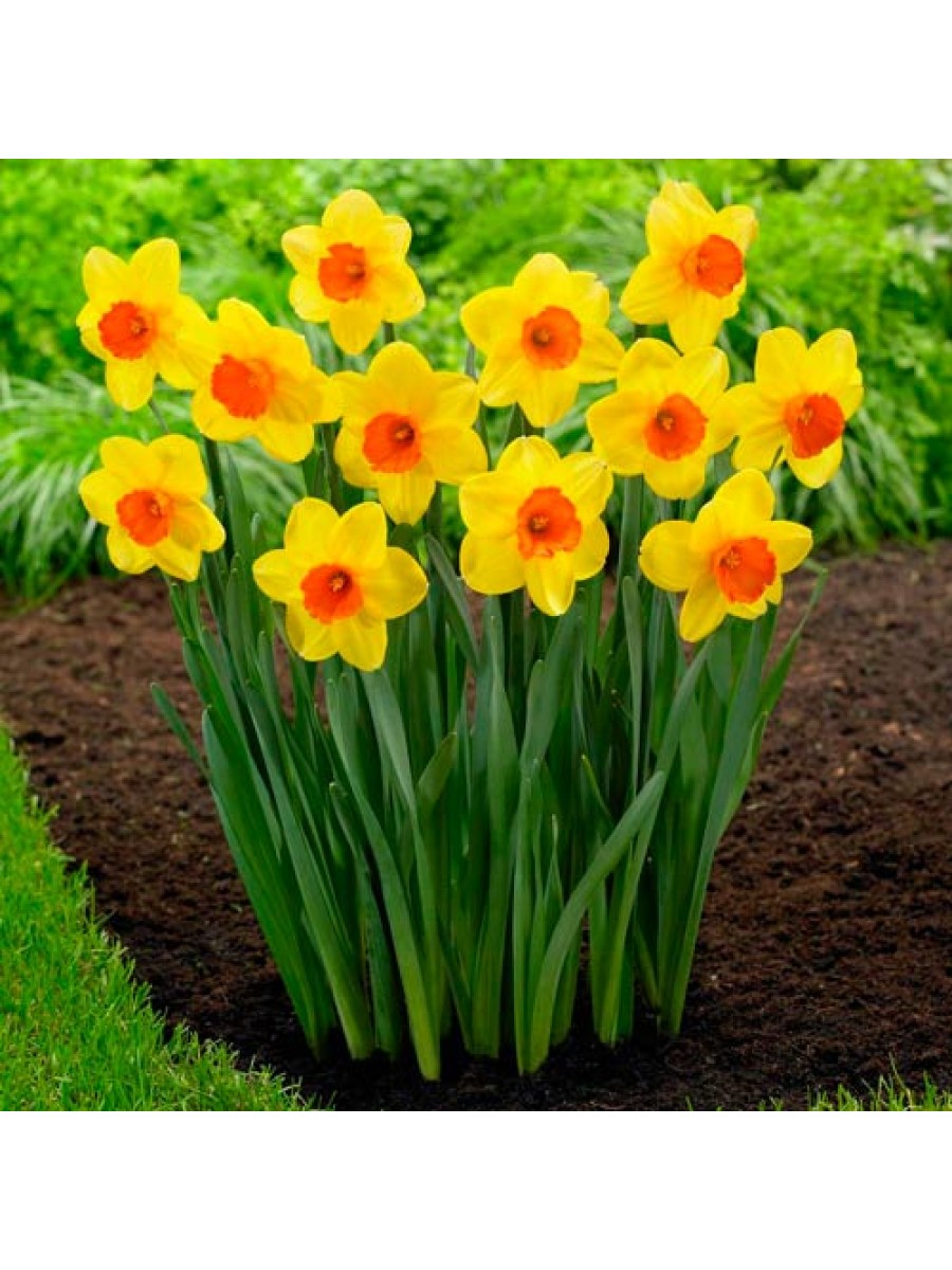 Этот цветок настолько ярок и ослепителен, что кажется сошедшим с картин Винсента Ван Гога – художника, который обожал желтый цвет. Яркие желтые лепестки контрастируют с сочным оранжевым центром, коронка четко выделяется на фоне основного желтого тона. Растение достигает в высоту 50 см, крепкие стебли несут крупные цветы, диаметр которых приближается к 8 см. Правила посадки Купить луковицы нарцисса Ред Девон необходимо до начала осени. Ведь это растение высаживают в открытый грунт с сентября по октябрь, лишь иногда захыватывая несколько дней ноября. Затягивать процедуру подзимней посадки луковиц не стоит, иначе растения не смогут перенести холодную зиму. Освещение – яркое солнце. Почва – питательный садовый грунт с легкой структурой. Защита от ветра – требуется, иначе полые стебли нарциссов могут легко поломаться.