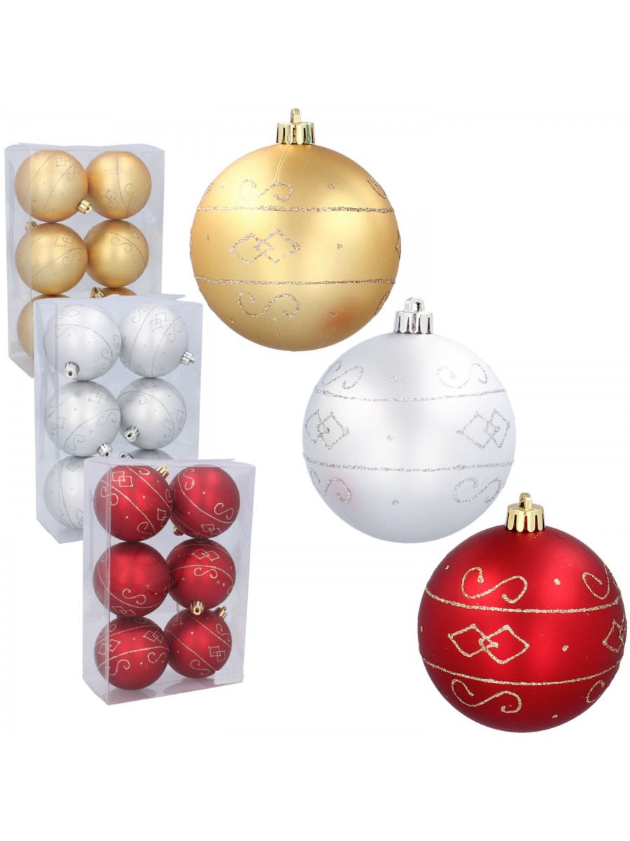 Шары елочные с рисунком 8см 6шт/уп золото, серебро, красный
