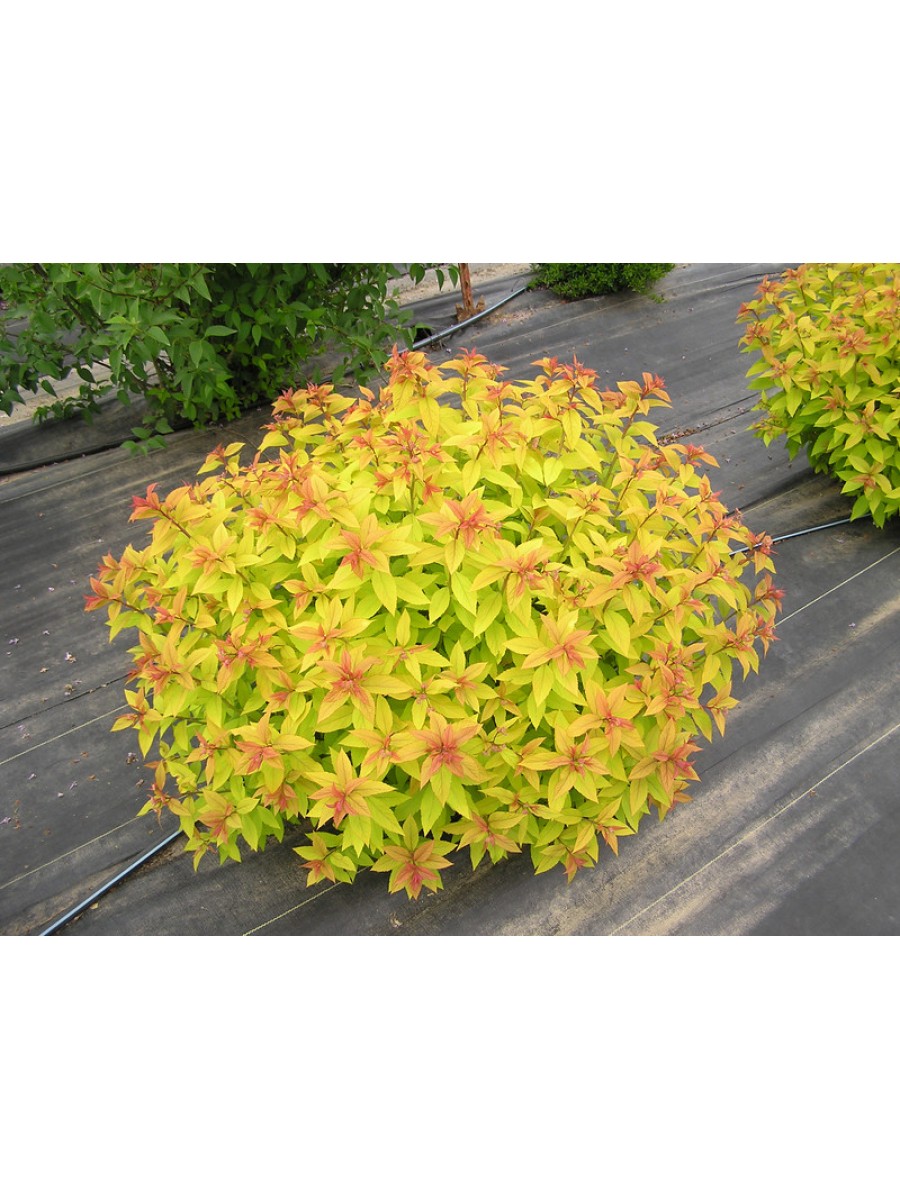 Спирея японская Голд Флейм (Spiraea japonica Goldflame) . Отличается многократным изменением оттенков желтой окраски листвы в течение сезона. Красивоцветущий кустарник с компактной плотной шаровидной кроной до 0,8 м высотой и в диаметре. Листья при распускании бронзово-оранжевые, потом золотисто-желтые, летом – зеленовато-желтые и осенью медно-оранжевые, длиной 5-8см. После цветения огненные краски листвы возвращаются. Осенняя окраска листьев — медно-оранжевого с золотом. Иногда на кусте появляются пестрые листья. Листья продолговатые, по краю зубчатые, 5-8 см длиной. Медленнорастущее, годовой прирост 0,1 м в высоту и 0,1 м в ширину. Цветки мелкие, ярко-розовые, собранные в щитках. Период цветения: конец июня – середина августа, средняя продолжительность цветения – 50 дней, цветение обильное. Зимостойкость и засухоустойчивость высокие. Предпочитает влажные плодородные почвы. Используется для создания невысоких живых изгородей, оформления водоемов, в кустарниковых группах, цветниках. Сорт светолюбив, но выносит и полутень, яркую окраску листья приобретают на солнечных участках, в тени они зеленеют. К почве не требователен, но предпочитает влажные, плодородные, рыхлые почвы. Используется в одиночных и групповых посадках, для создания невысоких живых изгородей и для оформления водоемов. Хорошо смотрится с хвойными, другими спиреями, барбарисами, пузыреплодниками.