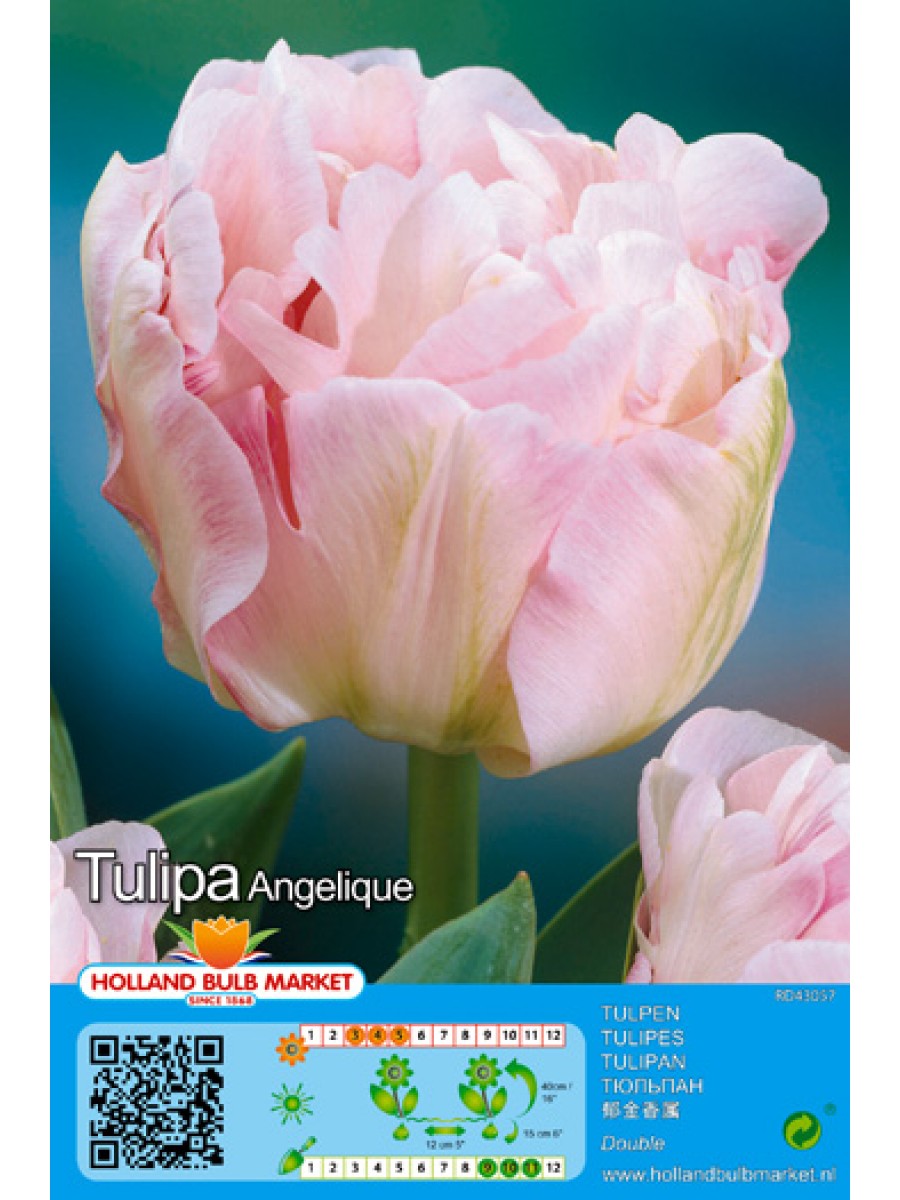 Тюльпан Angelique относится к махровым поздним сортам. Цветение приходится на май. Высота растения 35-40 см, средняя скорость роста. Цветок тюльпана Анжелика имеет большое количество лепестков образующих бутон бело-розового оттенка, высотой до 6 см, в диаметре до 9 см.