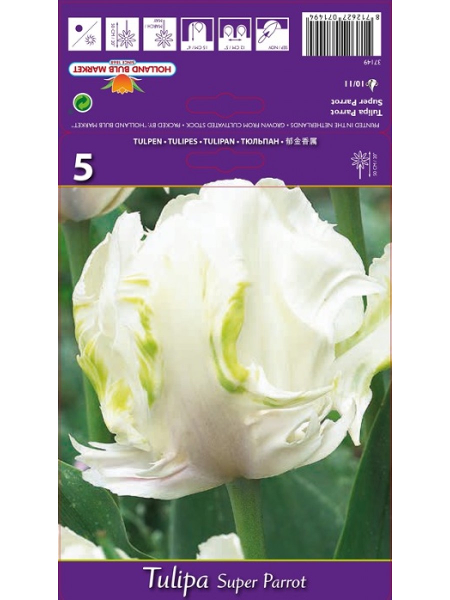 Попугайный тюльпан "Super Parrot" – экстравагантное растение, которое будет привлекать к себе внимание весь период цветения. Крупные цветы с белыми лепестками и зелеными прожилками обладают сильно волнистой и изрезанной на концах формой. Попугайными тюльпанами украшают клумбы, выращивают их в горшках для украшения дома и на срез для букетов. Попугаевидные тюльпаны имеют самый необычный и экзотический вид: лепестки с глубоко изрезанными краями, иногда волнистые, напоминающие растрепанные птичьи перья. Широко раскрытый цветок попугайных тюльпанов может достигать в диаметре 20см. Окраска у попуганных тюльпанов встречается самая разнообразная: от белоснежной до пурпурно-черной. Высота колеблется, в зависимости от сорта, от 40 до 65см. Цветут попуганные тюльпаны поздно, во второй половине мая. Высаживаются попуганные тюльпаны, как правило, отдельно от остальных тюльпанов, на переднем плане, чтобы в полной мере оценить их необычную внешность.